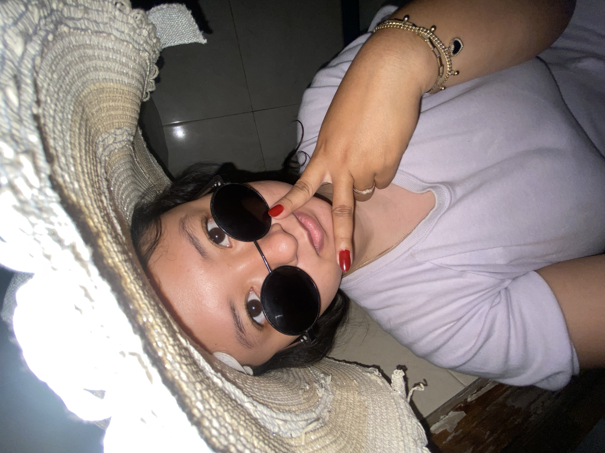 A person is lying on a floor wearing sunglasses and a hat, with their hand in front of their face. They are wearing a light-colored t-shirt and have a gold bracelet on their wrist. The floor appears to be tiled and has some markings. The photograph appears to be taken at night or in a dimly lit location. It's impossible to ascertain if the location is in Gelam, Indonesia without additional context.