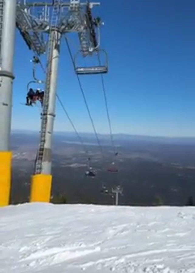 ski lift on a sunny day, with skiers ascending the mountain