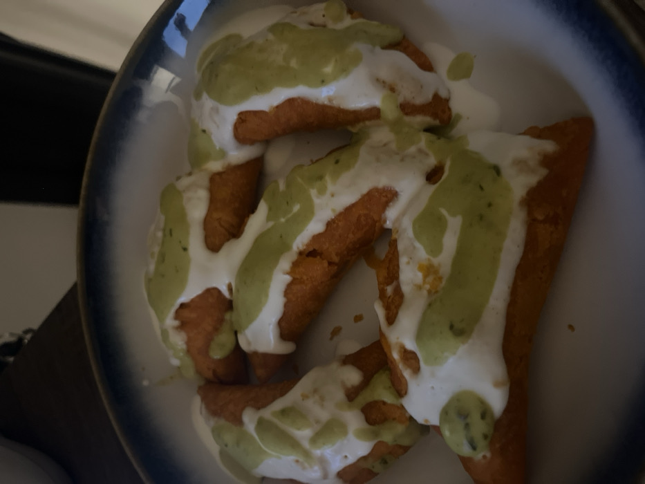 Four empanadas are arranged on a white plate with a dark blue rim. Each is topped with a generous swirl of white cream sauce with accents of light green pesto drizzled over them. The empanadas appear to be golden brown and triangular in shape, showcasing a fried texture. The sauces cover a significant portion of their surfaces.