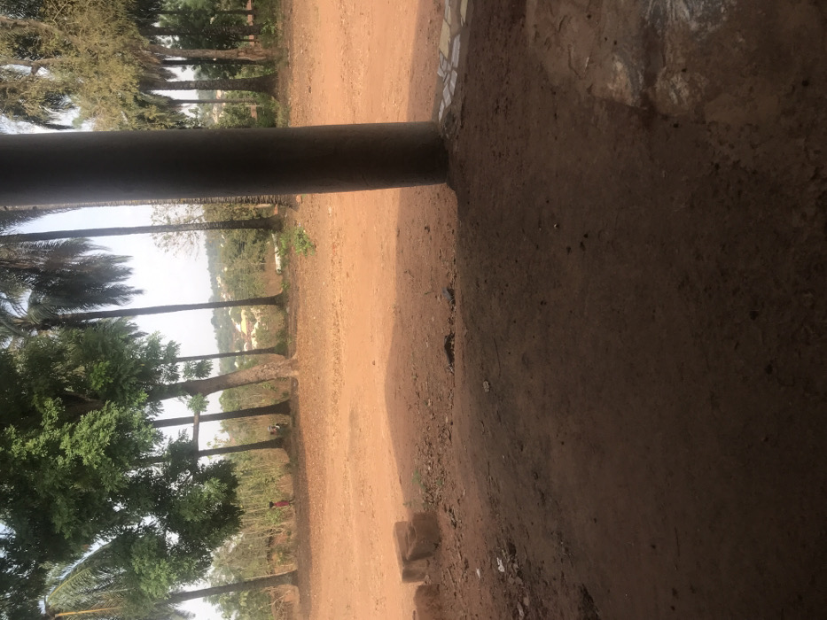 The scene depicts an outdoor environment in Okura, Nigeria, viewed from a shaded vantage point. The immediate foreground consists of dark, unpaved reddish-brown earth. To the left, two rectangular concrete blocks are stacked. To the right, a large, dark grey cylindrical pillar occupies the foreground, obscuring a portion of the scene, with lighter-colored fragments visible at its base. The midground comprises a wide, open expanse of reddish-orange dirt, under direct sunlight, appearing dry and unpaved. In the background, a dense line of various trees is visible, predominantly tall palm trees and other trees with vibrant green foliage. Beyond this tree line, distant residential structures with light-colored roofs are discernible on a gentle slope, suggesting a developed area. Three individuals are present in the mid-to-background. On the far left, a lone figure, possibly a child, with a red garment or object, walks from right to left across the dirt path. Closer to the center-left, partially obscured by tree trunks and foliage, two additional figures are visible standing or interacting beneath the trees. The overall lighting suggests a sunny daytime setting with clear skies.