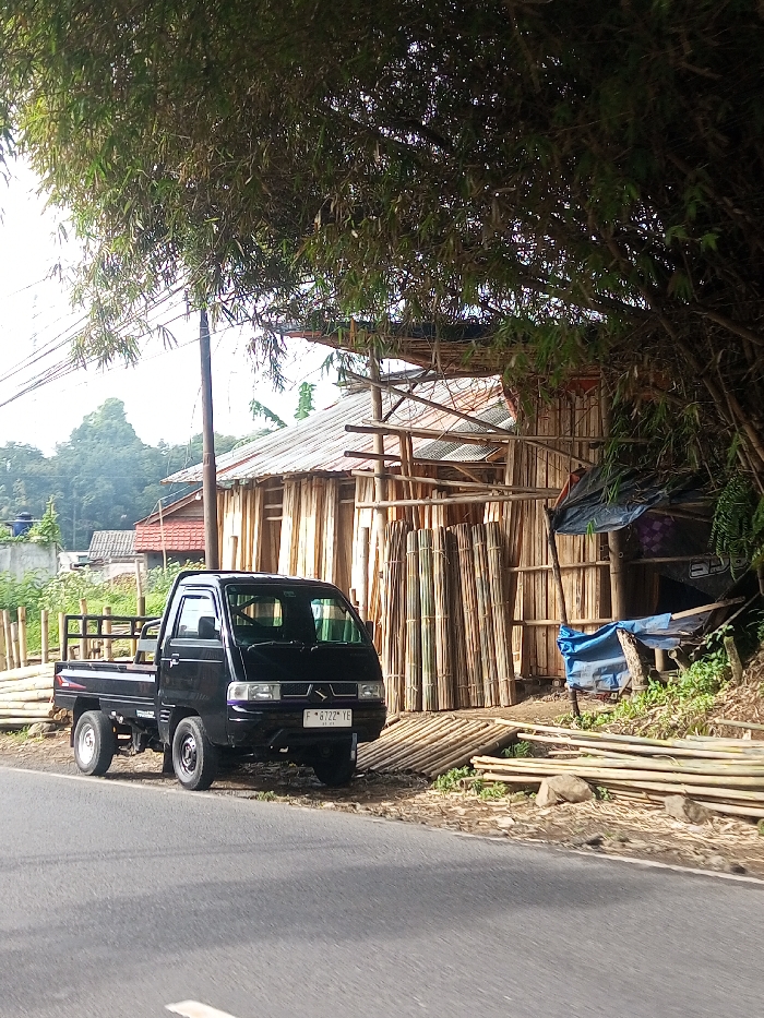 A black Suzuki Carry pickup truck is parked on the side of a road near a bamboo workshop. Bamboo stalks and planks are stacked around a makeshift structure with a tin roof. A section is covered with blue tarpaulin. Tall bamboo trees shade the scene, obscuring some details. Power lines run above. Hills and houses are visible in the background.