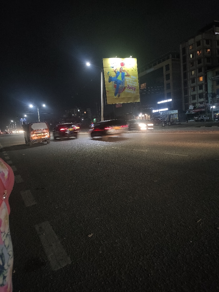 A nighttime shot of a busy street. Several vehicles, including a van and cars, are blurred from motion. A large billboard advertising "Juicy" stands prominently above the street. Buildings line the right side of the frame, illuminated with lights. Streetlights cast a glow on the asphalt road. The left edge of the image features a person's shoulder and floral-patterned clothing.