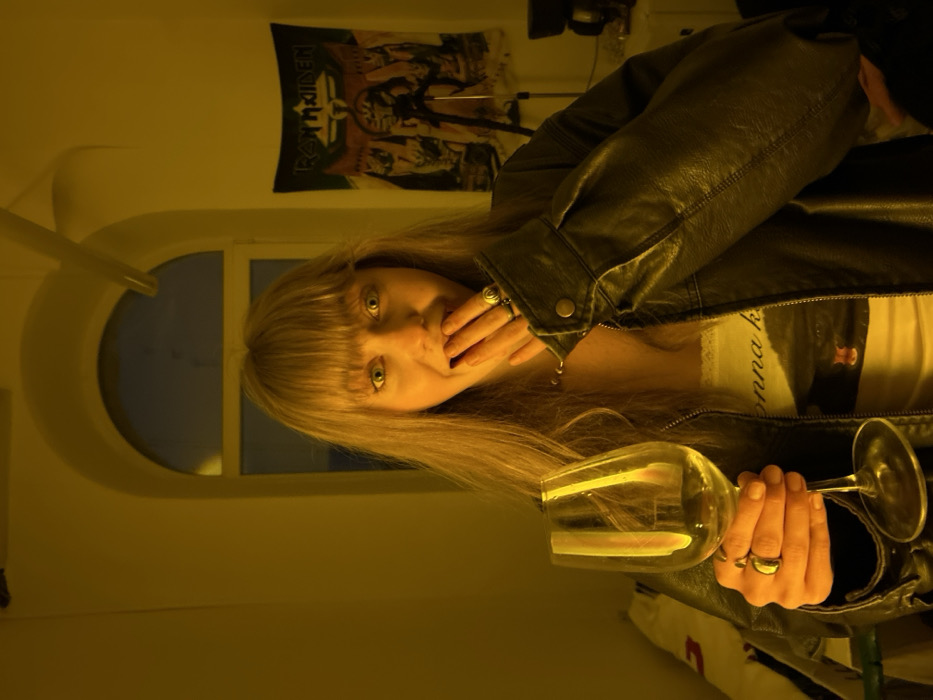 A fair-skinned, blond woman with bangs holds a wine glass, filled with a clear liquid, in her left hand. She has a hand up to her face. The woman is wearing a black leather jacket and a white top. A poster featuring the band Iron Maiden hangs on the wall behind her. A circular window is also visible. The picture has a yellow hue.