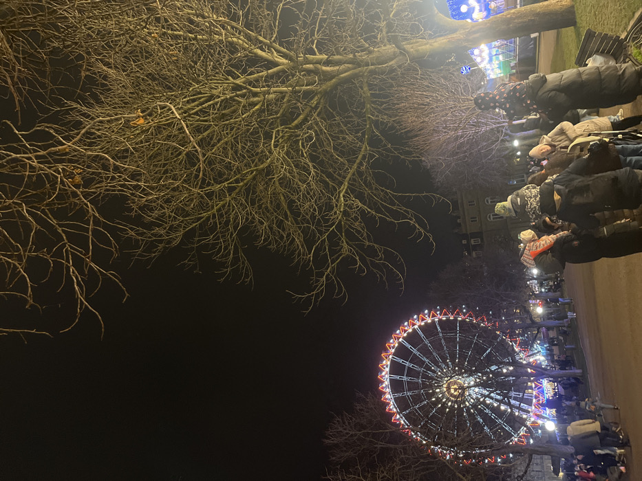 A night scene showcases a Ferris wheel adorned with red and white lights, partially obscured by bare tree branches
