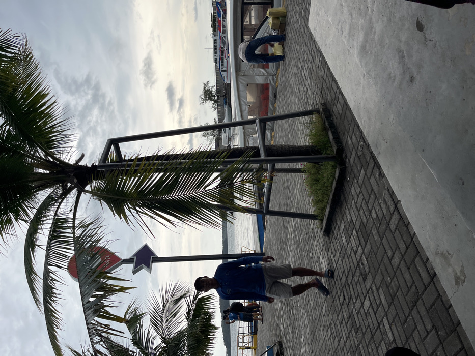The image depicts a harbor pier or port area in Sihanoukville, Cambodia, under an overcast sky. The foreground features a light gray concrete surface at the bottom right, transitioning into a dark gray interlocking brick paver walkway that dominates the midground. In the midground, a man with dark skin, short dark hair, wearing a long-sleeved dark blue collared shirt, light gray shorts, and dark blue slide sandals, walks towards the left side of the frame, looking slightly towards the viewer. Behind him and to his right, a slender palm tree with green fronds stands in a square planter with green vegetation, supported by a black metal brace. Immediately behind the man and the palm tree, a tall pole displays two signs: a large red heart-shaped location pin icon at the top, and a dark blue arrow pointing right below it. To the far left on the walkway, a small group of indistinct figures stands near a blue railing bordering the water. To the right of the palm tree, another individual, wearing a light-colored shirt and blue jeans, is bent over, facing away from the camera, attending to several yellow rectangular objects on the ground next to a white boat with a red interior. The background features a calm body of water, likely a bay or harbor, with various vessels. A prominent white boat with a white canvas cover and red seating is visible to the right. Further back, larger, multi-decked passenger boats are docked. A dark, tree-covered landmass or island is discernible in the distance across the water on the left horizon. The sky is overcast with varying shades of gray clouds.