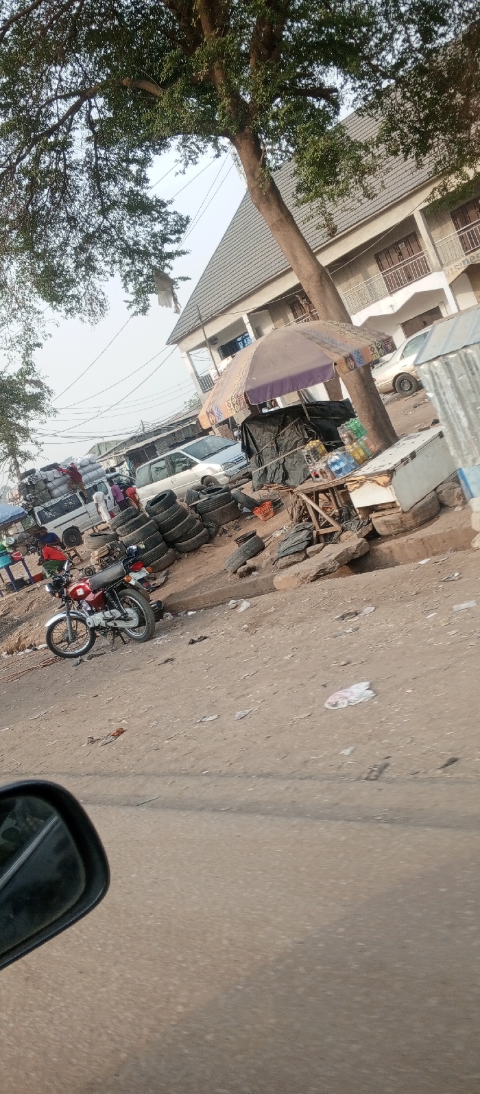 The image depicts an active roadside scene in Iddah, Nigeria, captured from the perspective of a vehicle, evidenced by a side mirror in the lower left. The foreground features a red motorcycle with chrome fenders parked on a dirt and gravel shoulder. Adjacent to the motorcycle are multiple stacks of used vehicle tires, indicating a tire sales or repair operation. Behind these tires, a white van is heavily laden with large, white bundled items on its roof rack, with an individual in a red shirt visible on top. Other people are discernible near the van and tire stacks. To the right, a makeshift stall operates under a patterned umbrella, displaying various bottled beverages on a wooden table. A small, corrugated metal-clad structure stands next to this stall. In the background, a multi-story building with a grey gabled roof, balconies, and brown-framed windows is visible. Overhead power lines traverse the scene. The general environment consists of dry, dusty ground with scattered debris and other parked vehicles in the distance. A large tree with green foliage dominates the upper left portion of the image. The scene is illuminated by natural daylight.