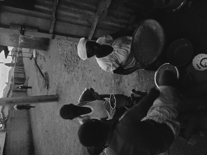 From an elevated angle, two individuals are working outdoors. One person, possibly a woman, wears a head covering and white clothing while handling a large, round object. The second person holds a smaller container. Several bowls and containers are nearby. The background shows a weathered building and open space. Another person walks by on the left, by a support beam, in the background. The scene suggests food preparation or a similar activity in a rural or communal setting.