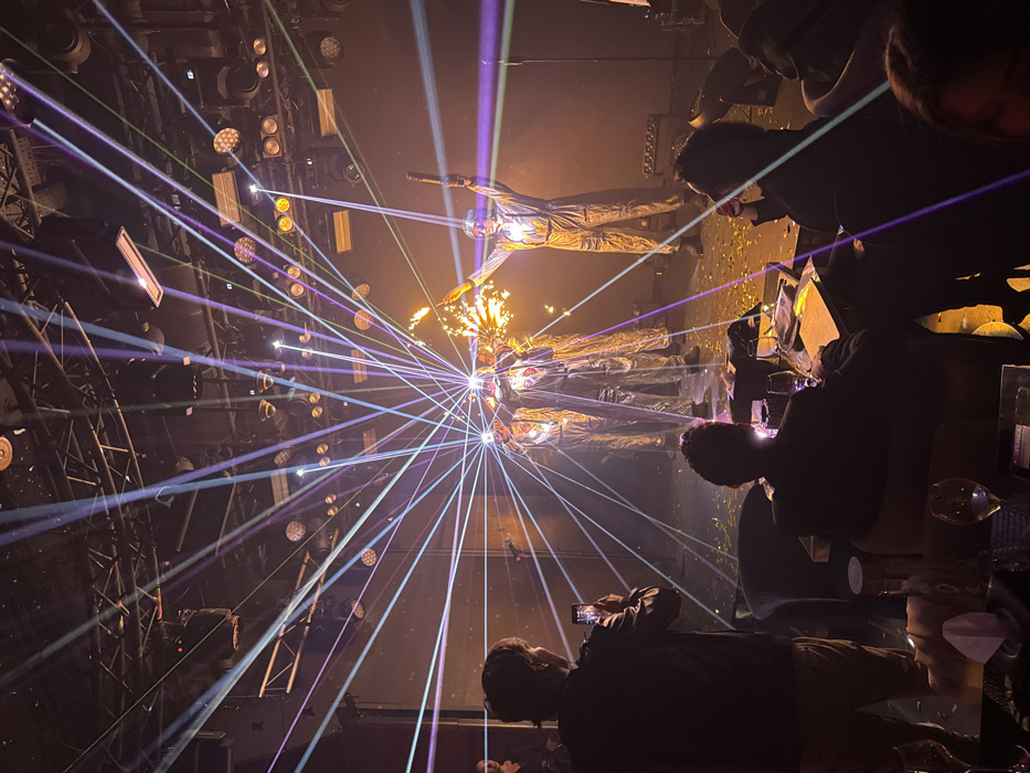 This image depicts an indoor entertainment venue, likely a nightclub or performance lounge, located in دبي (Dubai), United Arab Emirates. The scene captures a performance on an elevated stage, viewed from the audience area. On stage, four individuals are visible, each dressed in reflective, full-body jumpsuits with matching helmets or masks obscuring their faces. The performer on the far right raises a dark, rod-like object in their left hand. The performer immediately to their left is actively deploying a pyrotechnic effect, emitting a bright orange burst of sparks and flames from a handheld device. The remaining two performers stand behind and to the left. The stage floor is dark and scattered with golden confetti or glitter. The entire performance area is intensely illuminated by a prominent laser light show, featuring numerous converging beams of blue, purple, and green light that originate from a central point on the stage and radiate outwards into the venue. Additional stage lights and spotlights are mounted on an exposed truss system visible on the ceiling. In the foreground and midground, several audience members are seated at tables. One individual in the left midground, viewed from behind, is holding a smartphone vertically, actively recording or photographing the stage performance. Other partially visible audience members are seated at tables equipped with drinks, including wine glasses. The overall environment is dimly lit, emphasizing the stage lighting and special effects.
