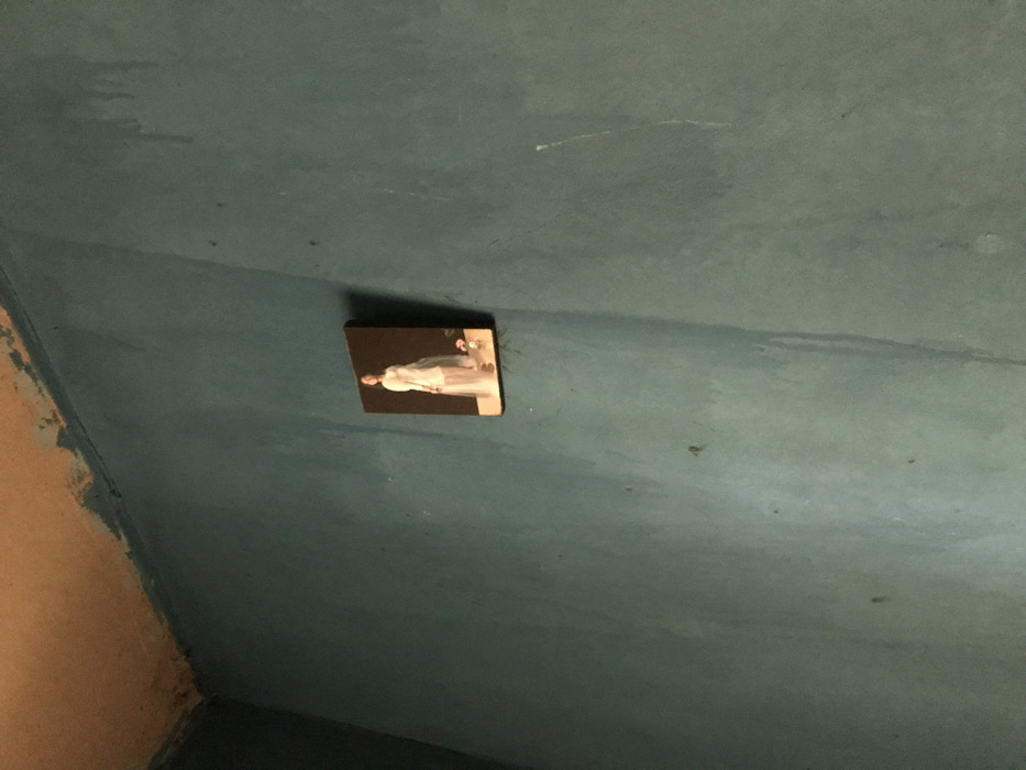 A small, dark-framed picture is mounted on a worn teal-painted wall in an interior room in Oba-Ile, Nigeria. The wall exhibits multiple dark vertical streaks, discoloration, and general surface deterioration. The ceiling above is painted a faded peach or light orange color, with noticeable wear and discoloration along the wall junction. The picture itself is a portrait of a standing female figure, possibly a young woman, wearing a light-colored, sheer gown with a full skirt. A small cluster of light-colored objects, possibly flowers, is visible to the lower right of the figure within the portrait.