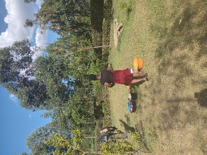 The scene is an outdoor, grassy area in Manda-Shivanga ward, Kenya. An individual, viewed from behind, wearing a dark short-sleeved top and a maroon pleated skirt, walks across the short, dry grass, moving slightly leftward away from the viewer. To the individual's left, on the grass, are two plastic basins: a dark-colored basin containing various textile items and an adjacent lighter-colored basin. Further to the individual's right, a large, empty orange plastic basin rests on the grass. In the far left background, some dark garments are visible hanging, partially obscured by foliage. The background features a dense line of various green trees and shrubs under a bright blue sky with scattered white cumulus clouds. Strong sunlight casts distinct shadows across the foreground and mid-ground.