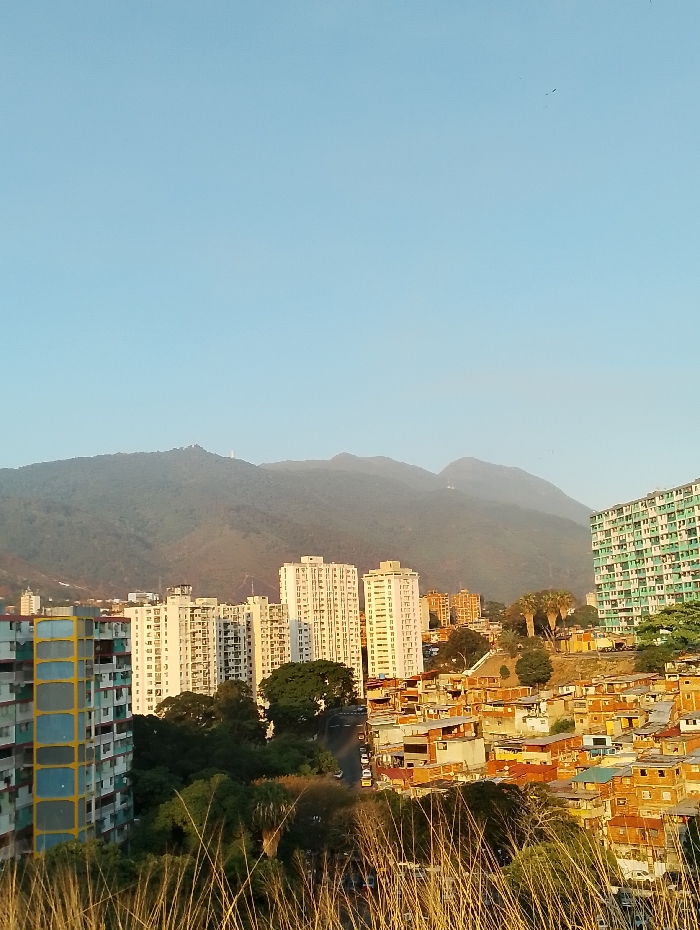 The image displays an elevated panoramic view of an urban environment in Caracas, Venezuela, under a clear, light blue sky. The scene is illuminated by warm, golden-hour light, suggesting late afternoon or early evening. A prominent, hazy green mountain range forms the distant backdrop, with visible peaks. In the mid-ground, a dense urban fabric unfolds. On the left, a multi-story residential building with a distinct blue and yellow grid facade is partially visible. Further right, several tall, white or light-colored high-rise apartment buildings stand amidst green foliage, including mature trees. A paved road with multiple vehicles parked or moving along it winds through this section of the city. Adjacent to these modern structures, extending towards the right side of the frame, is a sprawling informal settlement (barrio). This area consists of numerous tightly packed, multi-level structures built into a hillside, predominantly constructed from unpainted brick, concrete, and various roofing materials, exhibiting earthy tones of orange, brown, and ochre. On the far right, another large residential building with a teal and light green grid pattern is partially visible, appearing to be on a higher elevation. The immediate foreground is characterized by dry, golden-brown grass stalks that rise from the bottom edge of the image, indicating the vantage point. No discernible individuals, specific actions, or interactions are visible within the frame.