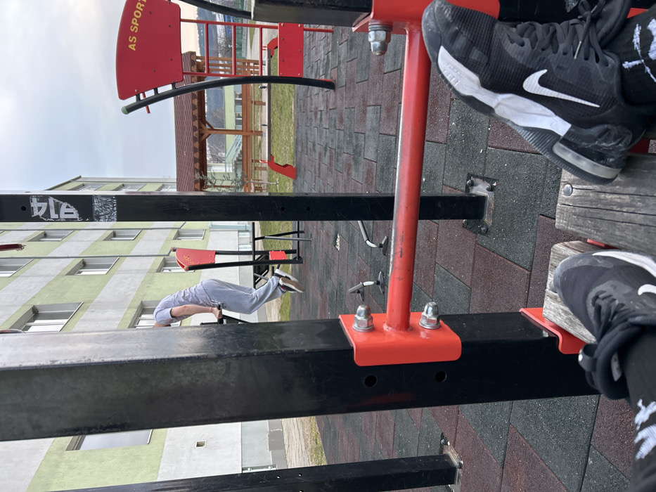 This image depicts an outdoor fitness park located in Panagyurishte, Bulgaria. The ground is surfaced with interlocking square rubber tiles in alternating patterns of red and black. In the immediate foreground, the feet of an individual are visible, resting on a wooden slatted platform that is part of an exercise machine. The visible footwear consists of black sneakers with white Nike swooshes and white soles, worn with black socks. A robust black vertical metal post with a horizontally mounted red metal bar, secured by large silver nuts and bolts, is prominently positioned to the left. Another similar structure is partially visible on the right. In the mid-ground, a male individual is engaged in performing dips on a parallel bar station. He is wearing a light grey short-sleeved t-shirt, light grey sweatpants, and brown sneakers with white soles. His body is elevated, with his feet off the ground, indicating the active phase of the exercise. His head is not visible within the frame. Other black and red fitness equipment, including a piece labeled "AS SPORT" on a red panel, is visible to the right of the exercising individual. Smaller push-up bars or similar ground-level exercise tools are also present on the rubber matting. The background features a multi-story residential building with a facade characterized by alternating light green and white horizontal bands, containing numerous windows. To the right of the building, a brown-roofed wooden gazebo with benches underneath is visible. Beyond the gazebo, a landscape with subtle distant structures and trees extends under an overcast sky.