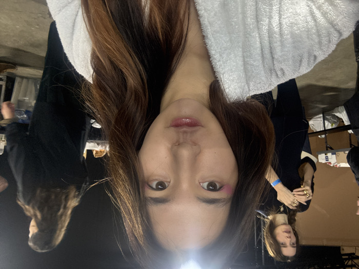 A selfie-style photograph captures a young East Asian female in the foreground, centered, wearing a white terrycloth robe. She has long, wavy, dark brown hair with reddish-brown highlights, parted slightly off-center, framing her face. Her eyes are brown, highlighted with bold pink winged eyeshadow, and her lips are glossy with a light pink tint. She looks directly at the camera. The background depicts an indoor setting in Issy-les-Moulineaux, France, appearing to be a backstage or preparation area. To the left, a tall individual with long, dark brown hair styled in a braid is visible, wearing a dark blue long-sleeved top. This individual's hands are adorned with multiple gold rings, and several gold necklaces are visible. A blue wristband is present on their left wrist. They stand with a neutral expression, looking towards the right. Behind them is a light brown wall and a table partially obscured, displaying white boxes and other supplies. To the right, partially visible behind the main subject's hair, another individual with long, dark, wavy hair is seen from behind, wearing a black long-sleeved top and dark trousers. They are positioned facing away from the camera, seemingly interacting with a table that holds various items. The background in this section is a darker, possibly black, curtain or wall. The floor is a dark, industrial-style surface. Overhead lighting is present, causing a bright glare in the top center of the image. The scene conveys an atmosphere of pre-event activity.