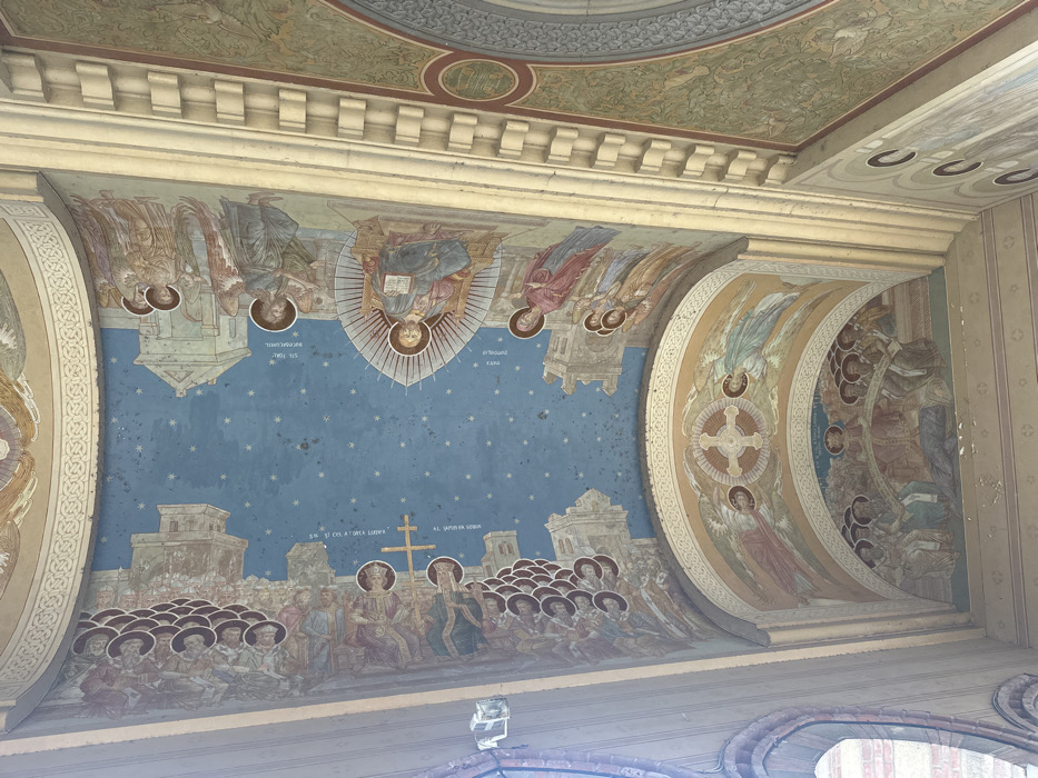 The image displays a detailed fresco painting covering a segment of the barrel-vaulted ceiling within the Mântuleasa Church in Craiova, Romania