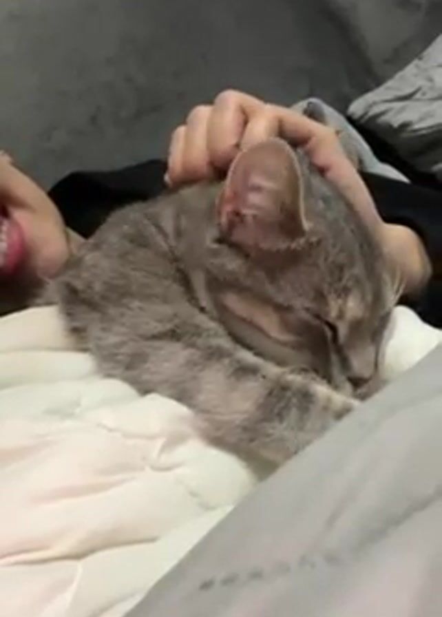A person is petting a sleeping tabby cat. The cat is curled up on a light-colored comforter on what appears to be a bed or couch. The person's hand gently strokes the cat's head. The person is smiling in the background, out of focus. The cat remains still, seemingly enjoying the petting.