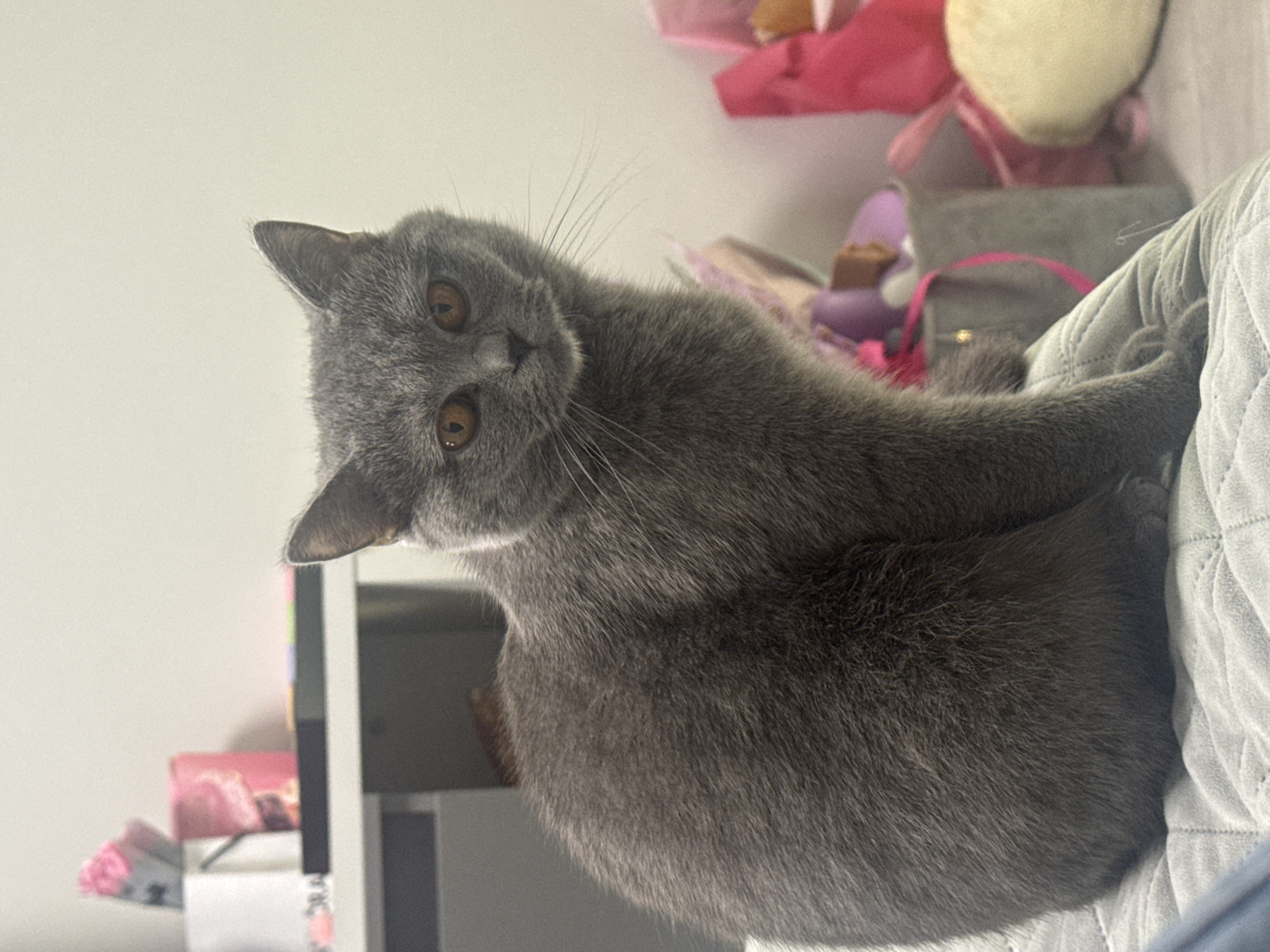 - "A grey British Shorthair cat is seated upright, facing the viewer, on a light grey quilted textile surface" by FM-OAANt1, licensed under CC BY 4.0