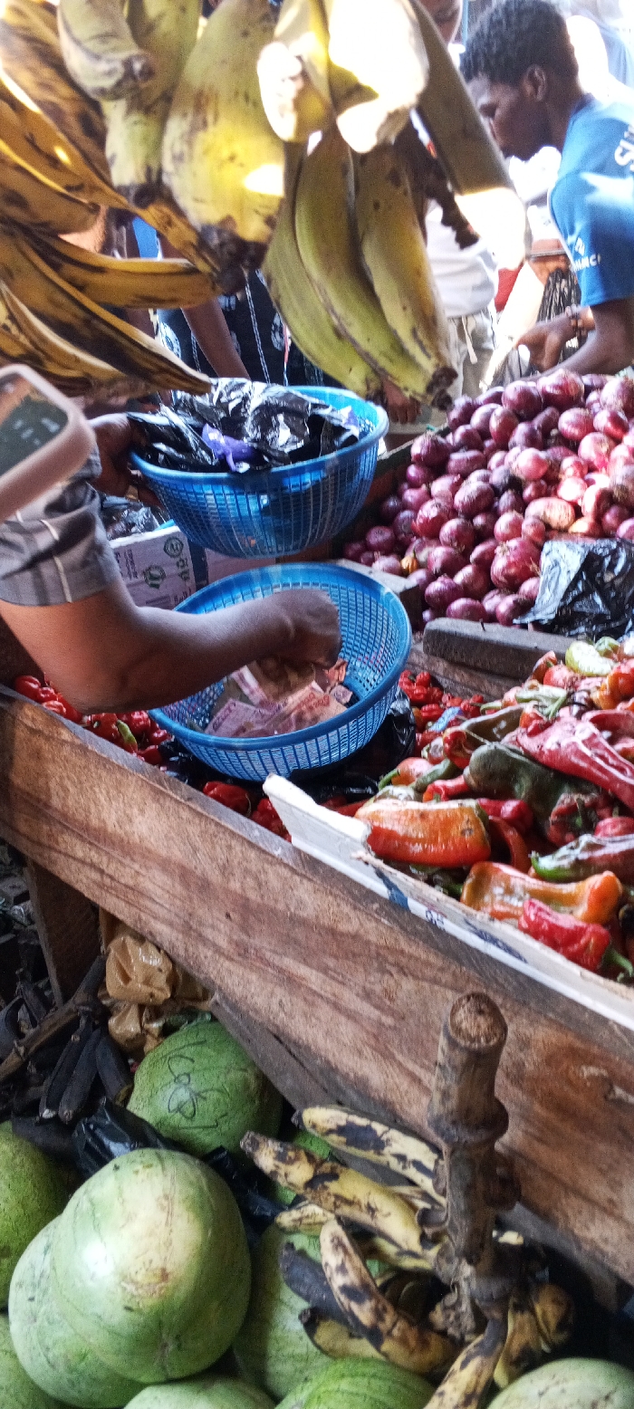 The image depicts a crowded open-air market stall in Nassarawa, Nigeria. In the foreground, a person's torso and left arm, wearing a grey checkered shirt, are visible, with the left hand reaching into a blue plastic woven basket containing red-orange Nigerian Naira banknotes. A smartphone is partially visible near the person's shoulder. Above this, another blue plastic basket holds items contained within black plastic bags. To the mid-right, a substantial pile of red onions rests on a wooden display surface. Below the onions, a diverse assortment of red, orange, and green peppers is arranged on another wooden surface. The upper section of the image features multiple bunches of hanging, ripening bananas or plantains. In the background, a male individual with dark, curly hair, wearing a blue shirt with "SURE BET" visible, attends to the market goods. The lower left quadrant shows several green watermelons and discarded banana peels, alongside other debris. The scene is illuminated by bright daylight, indicating an active commercial environment.