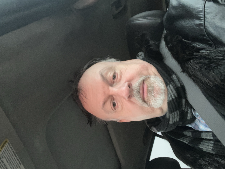 An adult male is depicted in a close-up, head-and-shoulders portrait taken inside a vehicle, likely in Moscow, Russia. The individual is Caucasian, middle-aged to elderly, with dark, disheveled hair and a graying goatee and mustache. His gaze is directed towards the camera. He wears a light-colored, possibly plaid shirt under a black and gray checkered scarf. Over this, he wears a black jacket, appearing to be a combination of faux fur on the left shoulder and a smooth, possibly leather-like material on the right. A dark gray seatbelt crosses diagonally from his right shoulder to his left hip. The vehicle's interior features a dark gray headliner and a dark seat behind him. A bright, diffused exterior light is visible through a window on the left side of the frame. A warning label is partially visible on the headliner above his left eye.