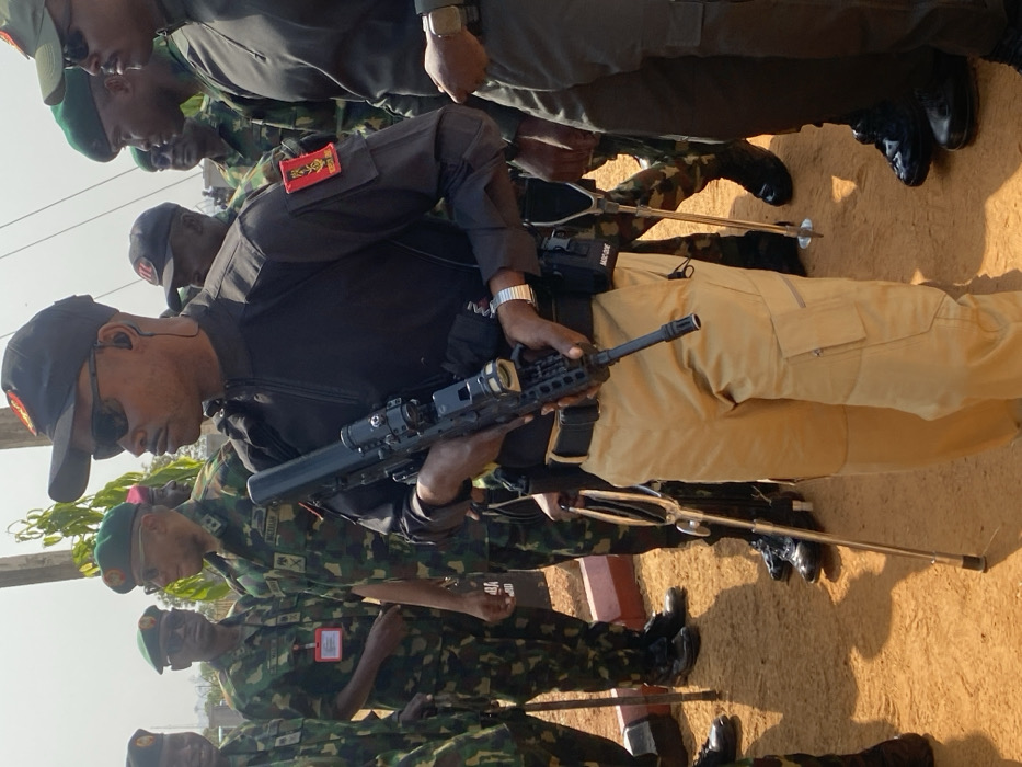 This image captures an outdoor scene in Kachia, Nigeria, showing a group of individuals, primarily military personnel, under bright daylight