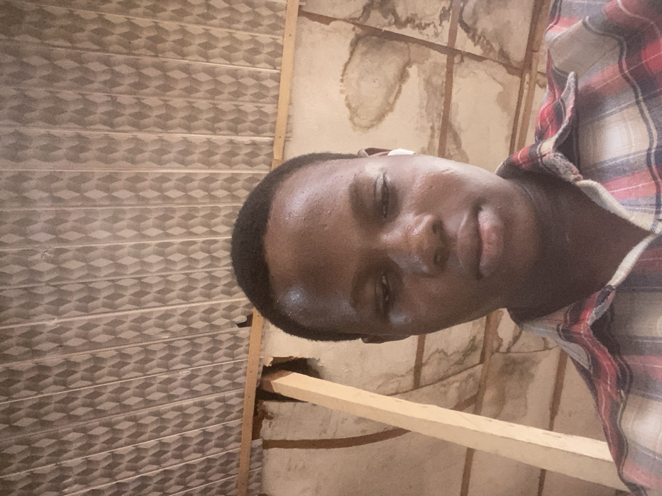 A young man with dark skin wears a red and grey plaid shirt. He has short, dark hair, and is looking at the camera with his eyes slightly closed. He appears to be inside, with a wall with a pattern behind him and another wall with stains. A light-colored wooden beam is visible near his chest. The picture is rotated, so the subject seems to be lying down.