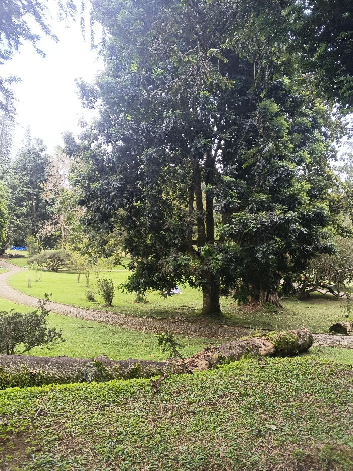 A lush, green landscape features a large tree dominating the scene, its dense foliage casting shadows on the grass below. A winding path meanders through the landscape, with a fallen log covered in moss in the foreground. Other trees of varying sizes are scattered around, contributing to the overall verdant and tranquil atmosphere. The scene is a combination of cultivated lawn and wilder natural elements.