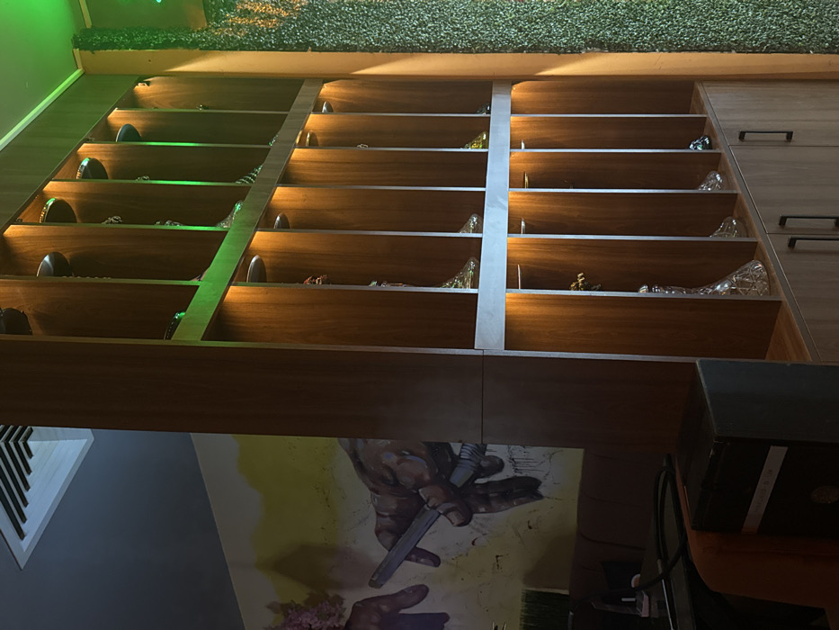 The image depicts the interior of a Chillbox shisha lounge in Sofia, Bulgaria. The scene is dimly lit, featuring a blend of warm and cool artificial light sources. On the left, a large wall mural presents a contemporary interpretation of Michelangelo's "The Creation of Adam." Two stylized hands are central to the mural: a hand on the left, adorned with pink floral elements, extends towards a hand on the right, which is holding a silver hookah hose. The mural's background transitions from yellow to light brown tones. Above this wall, a dark grey ceiling features a white, rectangular air vent with horizontal slats in the upper left corner. Below the mural, a dark brown upholstered bench seat and a dark tabletop are partially visible, with a black hookah pipe and hose resting on the table. A segment of an orange armchair and a dark rectangular cabinet are present in the lower left foreground. The central and right portions of the image are occupied by a floor-to-ceiling wooden shelving unit, serving as a room divider. This unit is divided into numerous vertical compartments, at least six wide and three high. Each compartment is illuminated from above by warm yellow LED strip lighting, showcasing various glass hookah bases and components, many of which are clear and elaborately designed. To the far right of the shelving unit, a vertical wall surface covered in artificial green foliage is visible, distinctly illuminated by a green light source positioned higher up. No individuals are present in the frame.