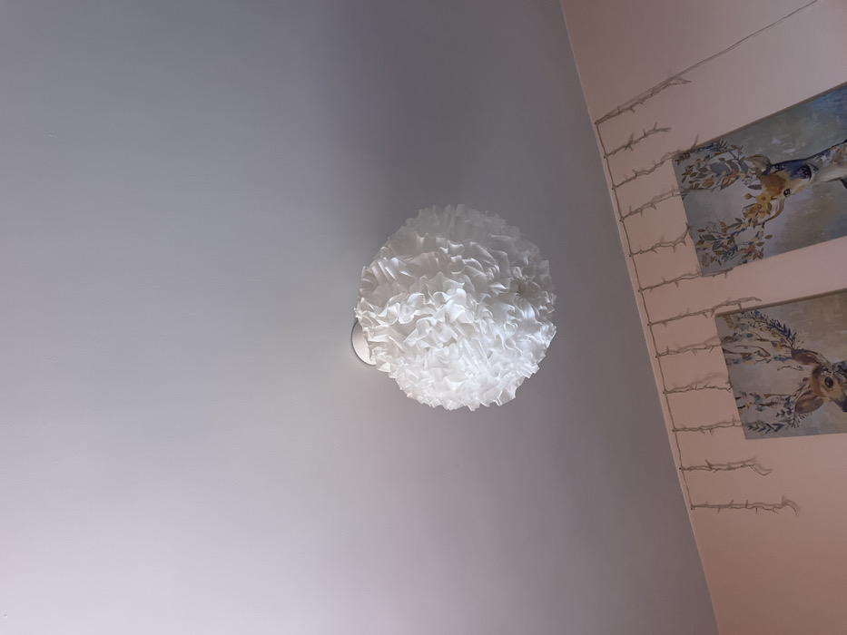 The image displays an interior room, identified as being in Karan Varbovka, Bulgaria, viewed from a low angle looking upwards. The ceiling is a plain, light-toned surface. Centrally positioned on the ceiling is a spherical, flush-mount light fixture featuring a shade constructed from multiple layers of ruffled white material, resembling paper or fabric. The wall visible in the lower portion of the frame is painted a light pink hue. Along the top of this wall, a horizontal string of unlit decorative lights is suspended. Below these lights, two rectangular framed art prints or canvases are mounted. Both prints depict stylized deer heads with prominent antlers adorned with floral and leafy designs; the deer on the left print faces slightly right, while the deer on the right print faces slightly left. No individuals or active interactions are depicted.