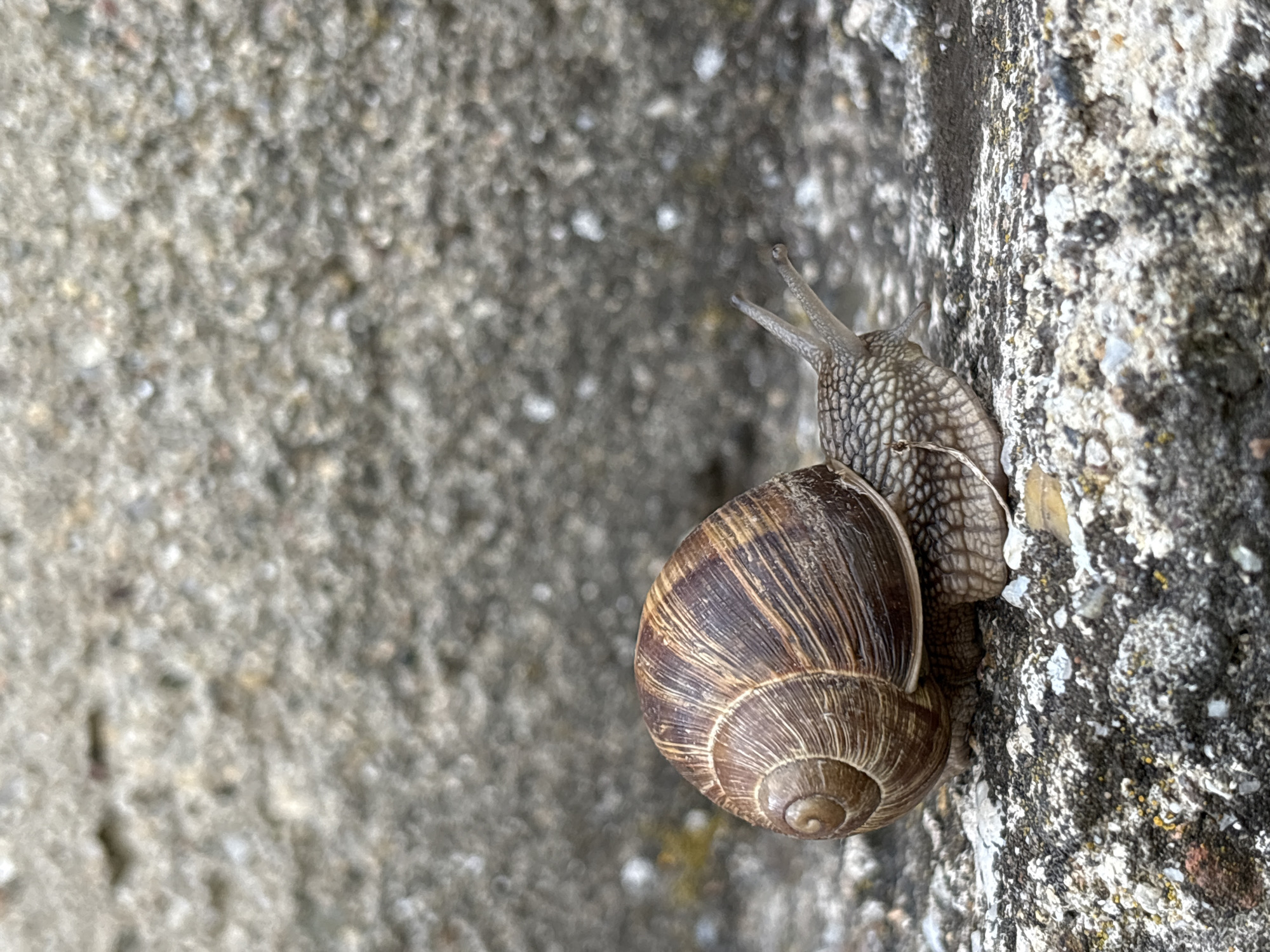 A snail crawls on a textured gray surface. The snail has a brown striped shell. The surface may be concrete. The location is in Rabrovo, Bulgaria.