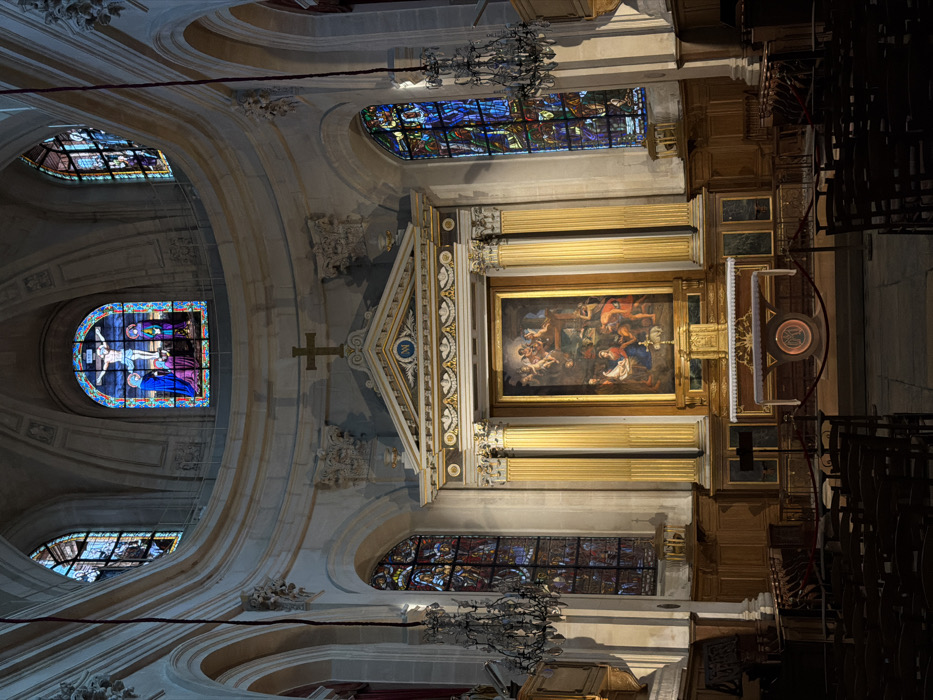 The image captures an interior view of a church, featuring an altar framed by golden columns and adorned with a painting of a biblical scene. Stained glass windows punctuate the walls, showcasing intricate designs and vibrant colors. A large arched ceiling with decorative molding enhances the architectural grandeur. Rows of chairs are visible on the right side, suggesting a space for congregation. Overhead, ornate chandeliers add to the ambiance of the sacred space.