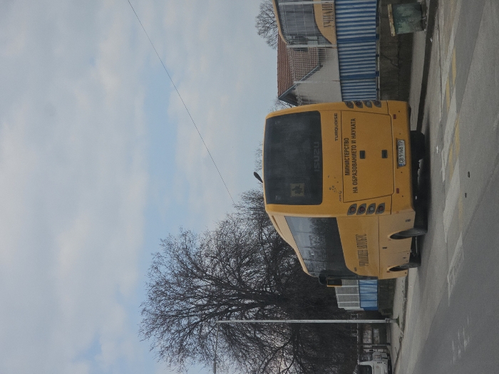 An outdoor, daytime image depicts the rear three-quarter view of a yellow Isuzu Turquoise bus, license plate CB 9168 TP (indicating Silistra, Bulgaria), parked on the right side of an asphalt road