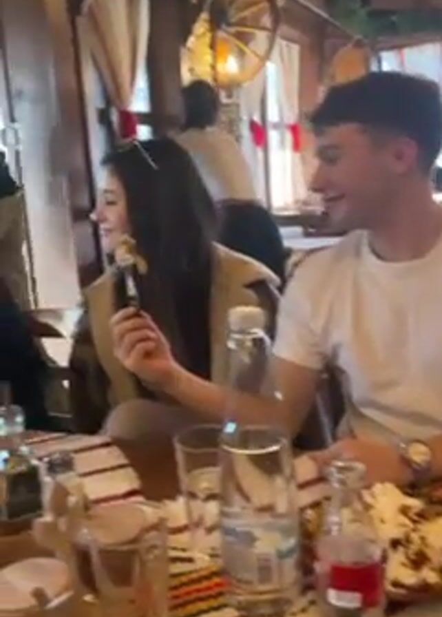 young man and woman sitting at a table in a restaurant. The woman is wearing a brown jacket with a light-colored lining and the man is wearing a white t-shirt. They are sitting at a table covered with a colorful striped tablecloth. On the table are several bottles of water and a bottle of Coca-Cola, as well as plates of food. The woman picks up a small spoon and appears to examine it. The man looks at the woman and smiles. There are other people visible in the background, including a waiter. The restaurant has a rustic decor, with wooden beams and a decorative wagon wheel on the wall.