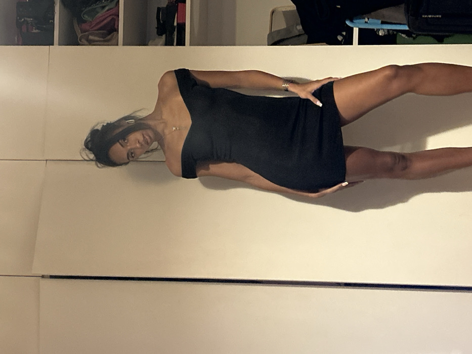 A woman poses in a black off-the-shoulder mini dress, her skin a rich brown tone. Her dark hair is partially pulled back. She stands in front of a white backdrop. A shelf unit with various items is visible in the upper-left corner. The woman’s hands are positioned on her thighs.