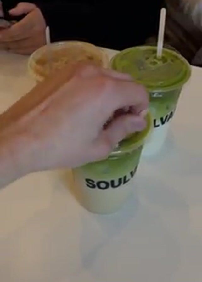 A hand removes the lid from a cup of matcha latte labeled "SOULVA" on a white table, revealing a wooden stirring stick. Two other cups of drinks, one a lighter-colored latte and the other matcha like the first, are also on the table. A person with a pink-floral phone in a hand with a cast is visible. The action of removing the lid and shaking the drinks is highlighted.