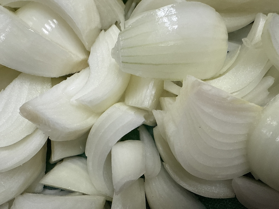 - "A close-up depicts a quantity of white onion pieces, uniformly chopped into various sizes and shapes, exhibiting their translucent, layered texture and moist appearance" by FM-bO7oP2, licensed under CC BY 4.0