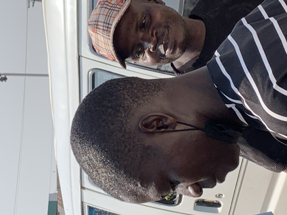 The image portrays two adult males outdoors in the city of Oyo, Nigeria, under bright daylight. In the foreground, an individual with dark skin is depicted in profile, facing left and looking downwards. This person has a close-cropped dark haircut, and a black fabric face mask hangs from their right ear. They are wearing a black shirt with white horizontal stripes. The skin on their forehead and face exhibits a sheen. Partially visible behind and to the right is a second adult male with dark skin, wearing a plaid baseball cap (brown, white, and red tones) and a dark-colored shirt. He is looking towards the left with a discernible smile or smirk. Directly behind both individuals is the side of a white passenger van or bus, featuring visible windows. The upper background shows a light, clear sky with faint, indistinct structures.