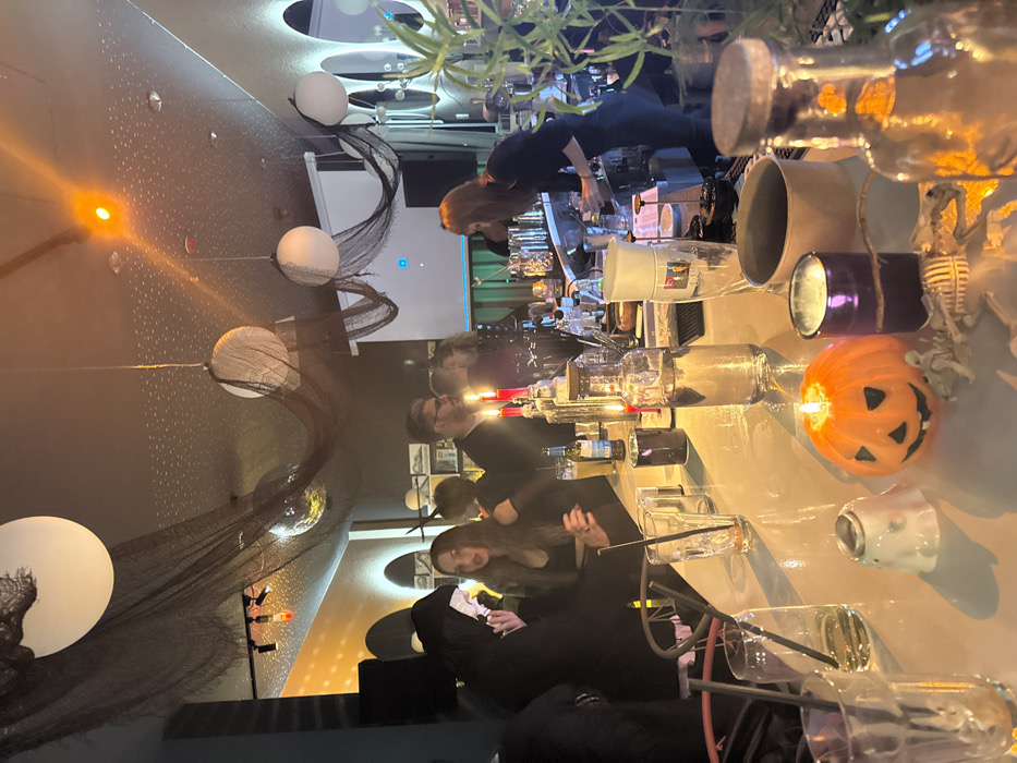 This image depicts an interior bar scene within a establishment in Rafailovići, Montenegro, likely during an evening or night event. The perspective is from the front of a light-colored bar counter, looking across at patrons and a bartender. The ceiling features black netting draped between three spherical white pendant lights and a small disco ball. Additional track lighting with orange-tinted bulbs illuminates a wall section on the left. A white projection screen, displaying a blue square, is visible on the far right wall. At the bar counter, a person dressed in a black hooded robe, possibly a costume, stands on the left, holding a dark object to their head, resembling a phone. To their immediate right, a woman with dark hair, wearing a black top, faces the hooded individual. Further right, a man with a beard and glasses is partially visible. The bar counter is populated with multiple items. In the foreground, from left to right, are several empty or partially full glasses, some containing dark straws. A lit pumpkin-shaped candle, a small white ghost figure, a lit purple candle in a holder, and a small plastic skeleton are arranged on the counter. Various glass bottles, some containing liquids, are present, along with beer bottles. Two tall, red tapered candles are actively burning in the mid-ground, providing additional illumination. Behind the bar counter, a female bartender with reddish-brown hair, dressed in a dark long-sleeved top and dark pants, is actively working on the right side of the frame. She is engaged with bar equipment, including shakers and bottles on a tiered display. A potted plant with green foliage is positioned on the far right of the bar. Other indistinct figures of patrons are visible in the background. The scene is illuminated by dim, atmospheric lighting from fixtures and candles.
