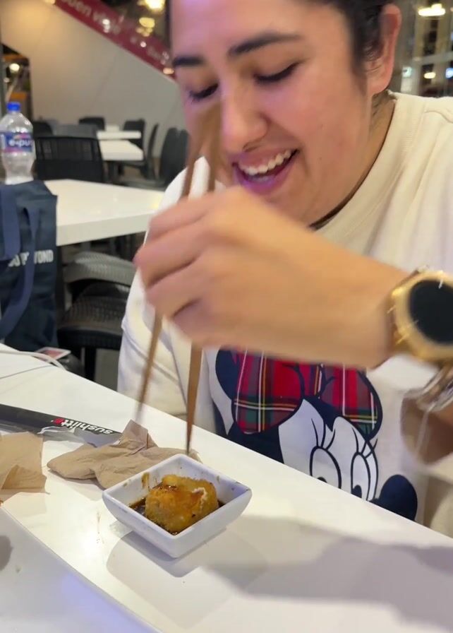 smiling woman using chopsticks to pick up food from a small square bowl of liquid. The food appears to be a fried cube of tofu. She is wearing a white Mickey Mouse sweatshirt and a gold watch. She appears to be struggling a little to grasp the tofu with her chopsticks, and she is smiling. She is sitting at a white table in what appears to be a food court. Other tables and chairs, as well as a water bottle, are visible in the background.