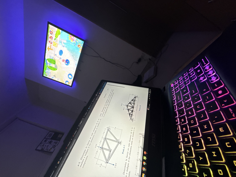 The scene depicts an interior room in Puebla City, Mexico, under low light conditions. In the foreground, an open MSI laptop is visible, featuring a vibrant rainbow-backlit keyboard. Its screen displays a digital document or textbook with engineering problems in Spanish, specifically illustrating truss structures for force analysis (e.g., "Determine la fuerza en cada elemento de la armadura..."). In the background, a wall-mounted flat-screen television displays a colorful video game, identified as "Mario Party," with characters and watermelon graphics on a blue-themed board. The television is illuminated from behind by a blue LED strip, casting a distinct glow on the light-colored wall. A power cable hangs vertically from the television. To the left, a framed picture or set of pictures is partially visible on the wall. No individuals are present in the image.