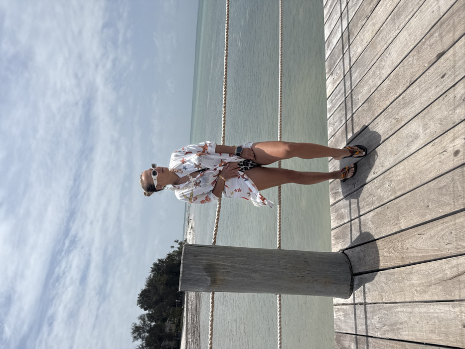 A female subject stands on a weathered wooden pier in Michamvi Kae, Tanzania