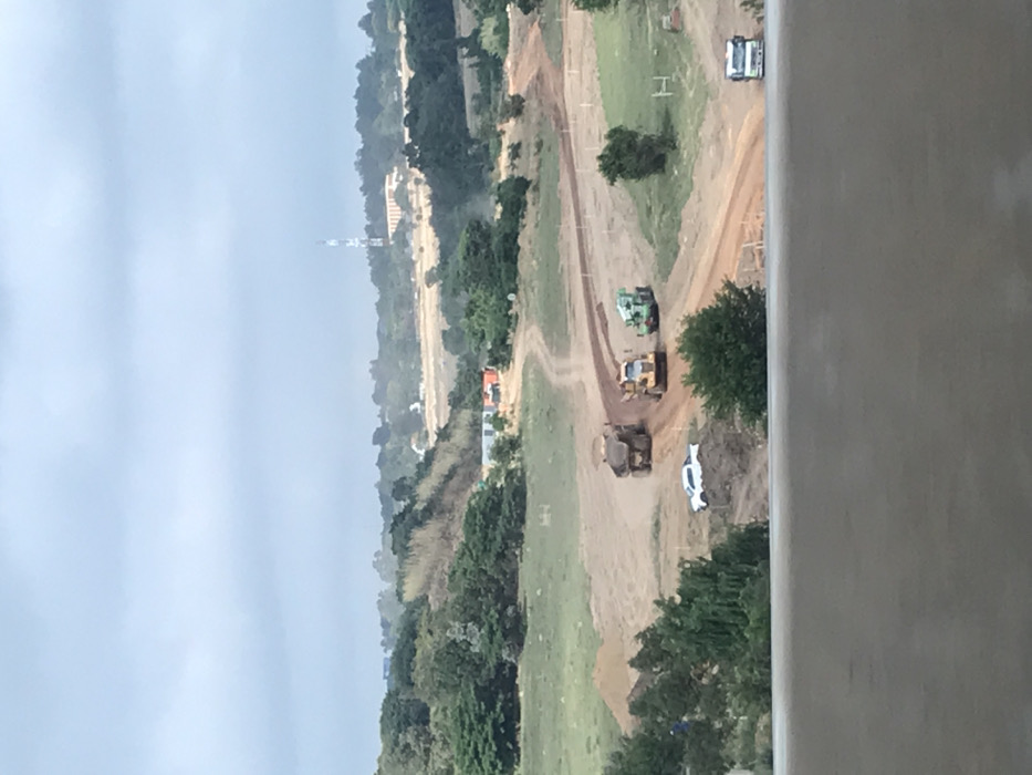 An aerial view captures a dirt road construction site with heavy machinery including a bulldozer, a grader and a large truck. A white car is parked nearby. The landscape includes a green field, scattered trees, and a tower in the distance, set against a cloudy sky. Part of a building is visible in the foreground.