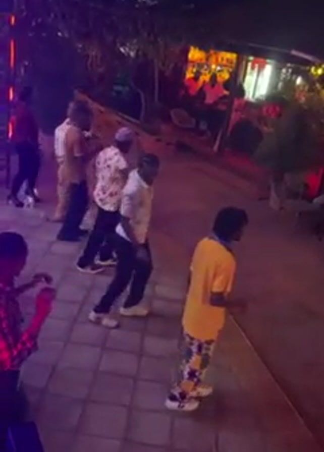 Several people are dancing in an outdoor setting with tile flooring. The area is lit with colorful lights. Some are wearing casual attire like plaid shirts and t-shirts, while others are dressed in button-down shirts and patterned pants. In the background, there's an open-air bar area with individuals seated and standing. Music is playing.
