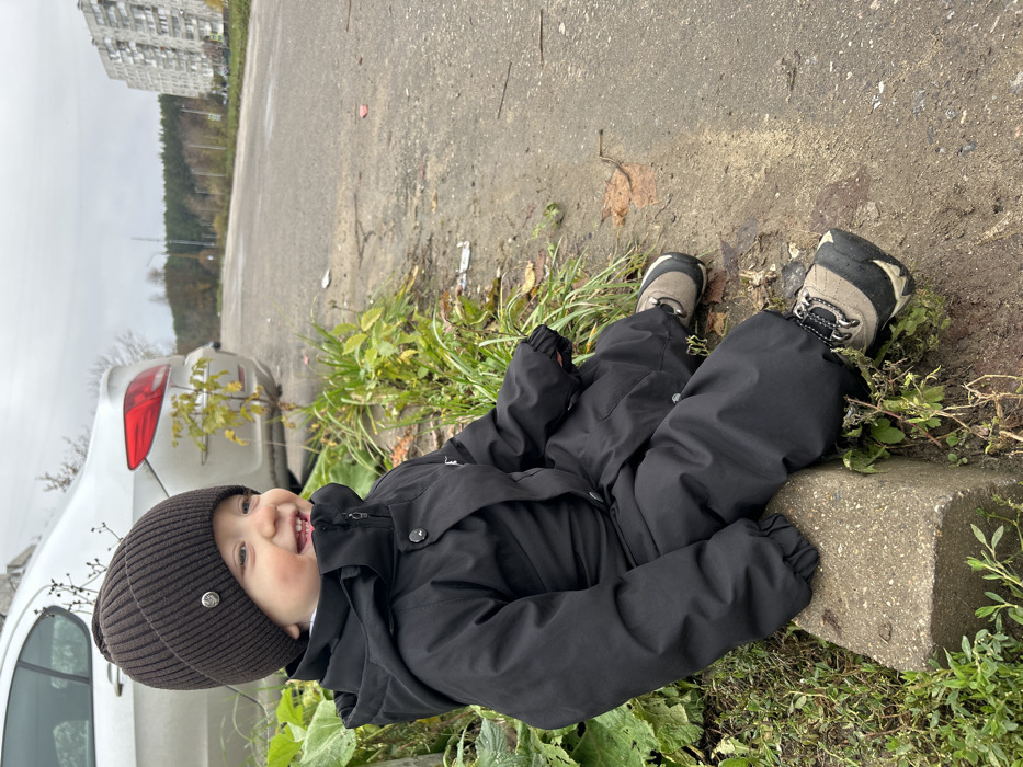 A young child is seated on a grey concrete curbstone at the edge of an asphalt road in Voskresensk, Russia. The child wears a dark brown ribbed knit beanie with a circular metallic emblem, a black hooded full-body jumpsuit with a snap-button placket, and tan and black boots. The child's mouth is open in a smile, revealing teeth, and eyes are open, directed to the right. Immediately behind the child and the curb is a strip of overgrown vegetation and damp earth. To the left, the rear quarter of a silver sedan is parked. The asphalt road surface, marked with scattered debris, extends into the midground. In the background, a weathered multi-story apartment building is visible to the right, with a dense treeline further behind, all under an overcast grey sky.