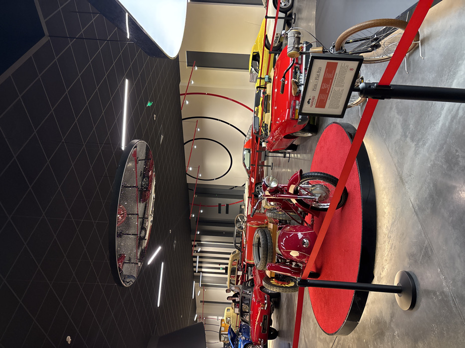 The image depicts the interior of a vehicle museum or exhibition hall located in Markovo, Bulgaria. The environment features a light grey concrete floor and a dark, tiled ceiling equipped with linear LED lighting and a prominent, circular mirrored fixture that reflects the room. Walls are light-toned with black vertical stripes and decorative abstract red and black curved lines. In the foreground, a dark red vintage motorcycle with a sidecar is centrally displayed on a raised, circular platform covered in red carpet. The sidecar carries two spare tires stacked on wooden planks. This display is cordoned off by a black stanchion and red rope barrier. To the immediate right of the motorcycle, a red convertible car, identified by an adjacent sign as "Pirin - Fiat 850," is also exhibited and roped off. A vintage bicycle with cream-colored tires is positioned on the far right foreground, near the red convertible and its informational sign. The mid-ground and background showcase numerous other classic automobiles as stationary exhibits. These include multiple red sports cars, a bright yellow sports car, a dark blue convertible, and various sedans. Two adult individuals are visible in the left mid-background, standing near a light-colored sedan, appearing to observe the displayed vehicles. No direct interactions with the exhibits are apparent.