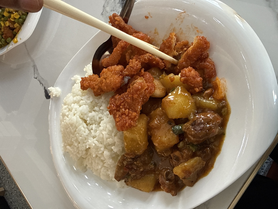 An overhead view captures a meal served on a white, oval-shaped plate positioned on a light-colored, veined surface, consistent with a dining table, in Daxing District, China. The plate holds three distinct food items: a mound of white, steamed rice on the left; a stew of cut potatoes or similar yellow vegetables and dark meat pieces in a reddish-brown sauce in the bottom-left and center; and several pieces of reddish-orange, breaded fried chicken on the right. A silver-colored spoon with a dark handle is partially visible underneath the fried chicken. A hand with medium-dark skin tone, positioned in the upper-right, uses a pair of light-colored chopsticks to grasp one of the fried chicken pieces. In the upper-right background, a portion of another white dish containing green peas and corn is visible.