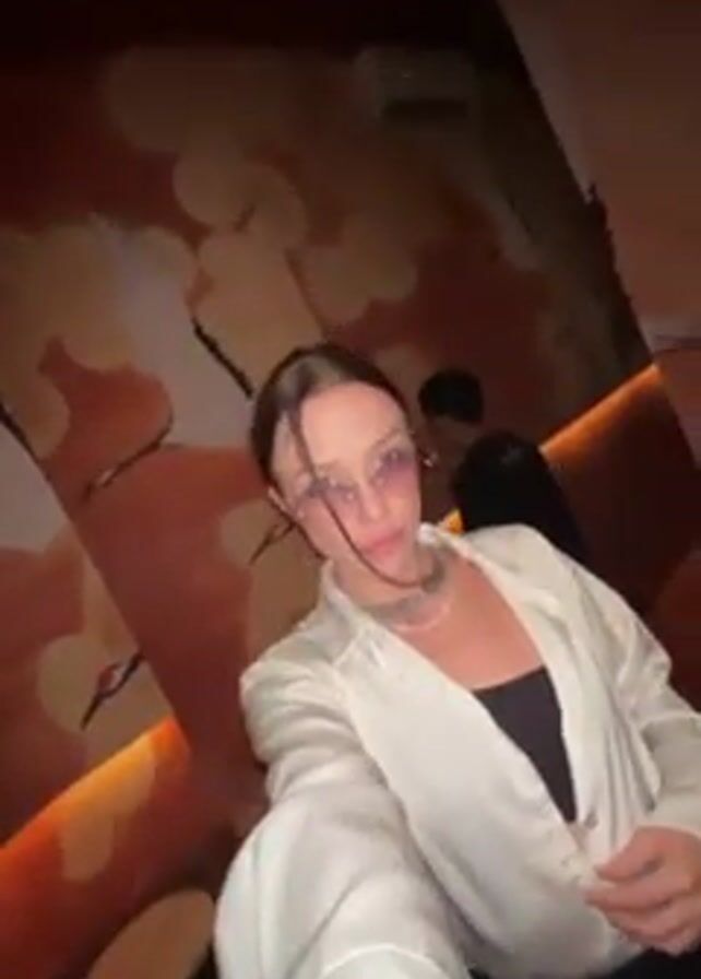 A woman is in what appears to be a bar or lounge. The camera angle is low, as if she is holding the camera herself. She is wearing pink-tinted glasses, a white unbuttoned shirt over a black top, and a silver choker necklace. Her hair is pulled back in a bun. The walls around her are decorated with a pattern of light circles and drawings of white birds against an orange background. The lighting is dim and warm. She looks into the camera, briefly adjusting her hair with her hand. The background is blurred. Upbeat music plays.