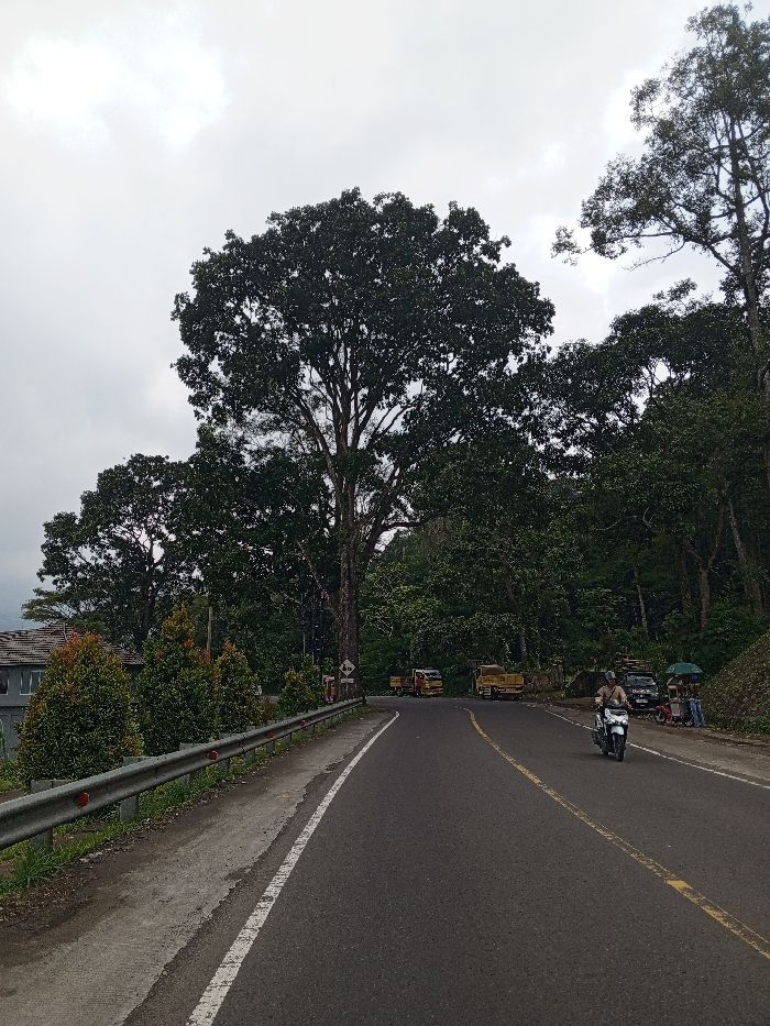 The scene depicts a winding two-lane asphalt road under an overcast sky, observed in Multhan, India. The road features a solid white line marking the shoulder on the left and a double solid yellow line indicating the center. On the immediate left, a metal guardrail with red reflectors runs alongside the road, separating it from a strip of dirt and grass. Beyond the guardrail, a row of small, reddish-green bushes is visible, followed by a building with a dark roof and light-colored walls. Large, dense trees form a prominent canopy overhead and extend into the background on both sides of the road. On the right side of the road, the terrain slopes upward into a densely forested area. In the distance on this side, several light-colored flatbed trucks are parked or stationary. Closer to the foreground, a roadside vending area is established. This area includes at least two individuals, one standing near a stall sheltered by a green umbrella, possibly selling goods. A bicycle is parked nearby, and a dark-colored car is stopped adjacent to the vending setup. In the right lane of the road, a single individual is operating a white scooter or motorcycle, traveling away from the viewer. The operator is wearing a light-colored helmet and clothing.