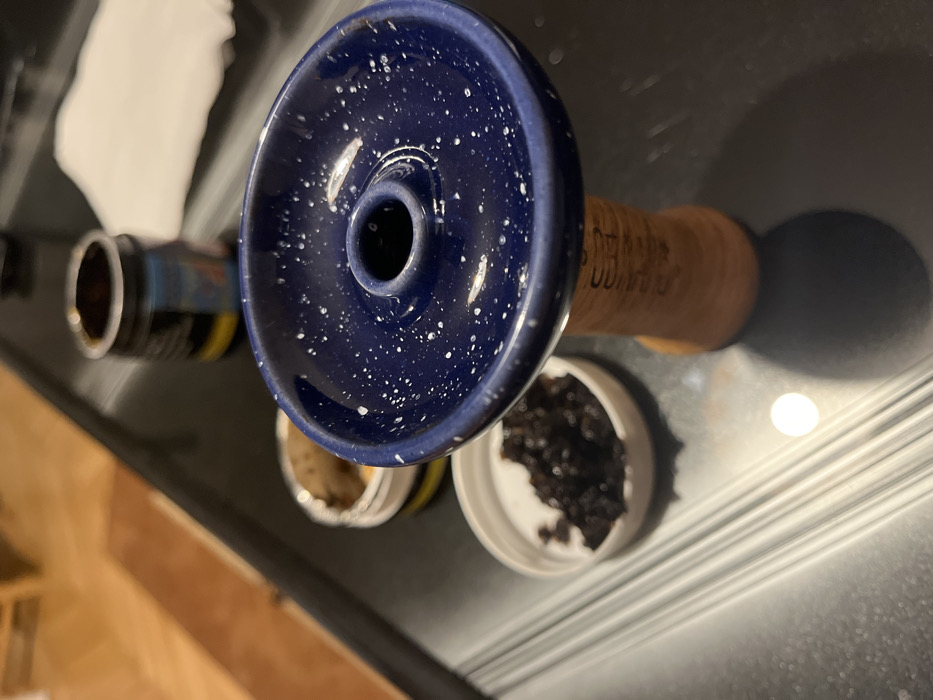 The scene is set indoors in Plovdiv, Bulgaria. A dark blue, ceramic phunnel-style hookah bowl, speckled with white, is centrally positioned on a light brown, terracotta-colored base. To the left of the hookah bowl, a white plastic lid contains a pile of dark, moist shisha tobacco. Behind the white lid, an open, round metal tin with yellow and black labeling also holds shisha tobacco. In the blurred background to the upper right, a dark-colored jar or container and a crumpled white tissue are visible. All objects are situated on a glossy, dark, reflective tabletop, which exhibits a circular light reflection and a distinct shadow cast by the hookah bowl. The background beyond the tabletop is out of focus, showing a wooden floor or piece of furniture. No individuals are present.
