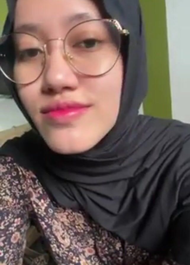 A woman wearing a black hijab and round gold-rimmed glasses is looking at the camera. She is wearing a printed dress. Her lips are painted with a bright pink gloss. The background is a green and white striped wall. The camera zooms in on her lips.