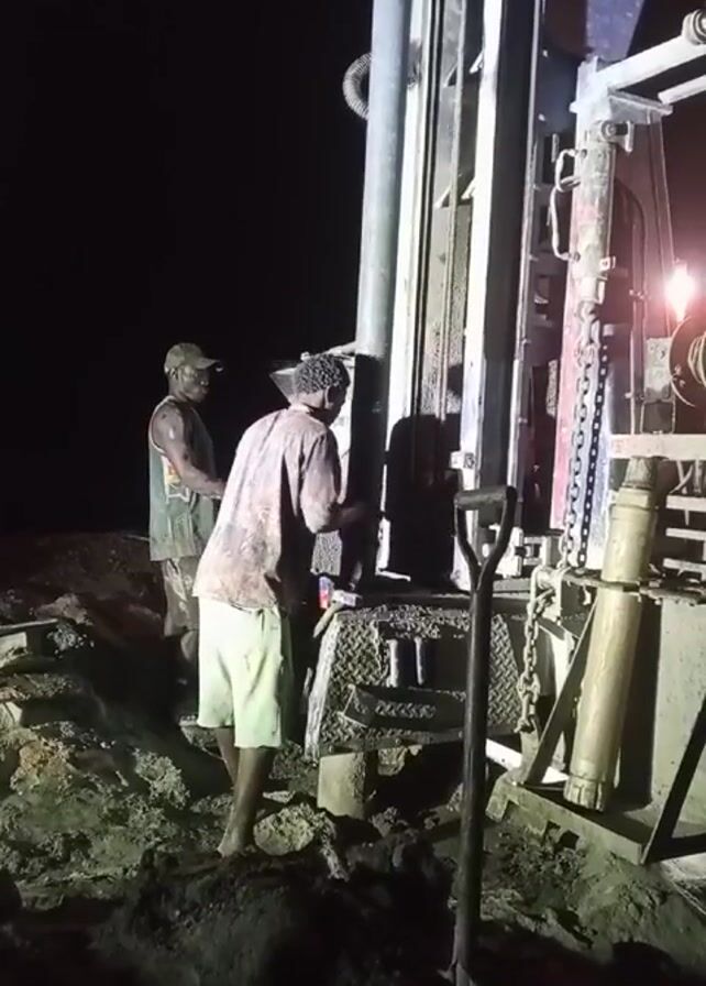 In a dark outdoor setting at night, two men are working next to a large drilling rig. The men are positioned close to the rig, appearing to be interacting with it. One man is wearing a printed short-sleeved shirt and light-colored shorts, while the other is wearing a tank top and a cap. A shovel is resting against the rig. The ground around the rig is muddy. A light source illuminates the drilling equipment and the men from the side, while the overall environment remains dark.