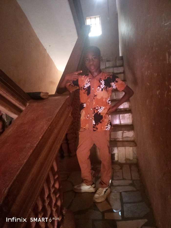 A young person stands on a staircase, posing with one hand on their hip and the other making a peace sign. They wear a floral button-down shirt, matching pants, and sneakers. The staircase is narrow and dimly lit, with stone steps and dark walls. An old-fashioned wooden banister is visible on the left, and a small window is at the top of the stairs. The lighting is poor, with some areas appearing dark and shadowy. An "Infinix SMART 6 PLUS" watermark is at the bottom of the image.